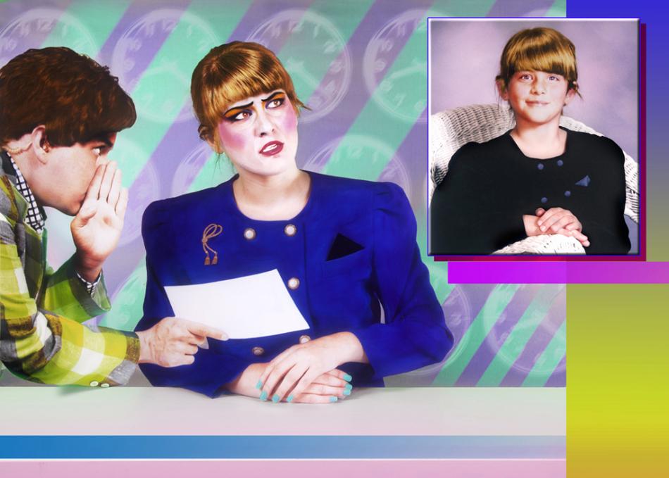 On view on the Inc.’s external Cannon Project Wall, Breaking News consists of a series of hand tinted self-portrait photographs that satirize the format and content of news reports. Through parody and caricature, heavy subject matter such as abduction, flood, disaster, televised suicide, and dictatorship are depicted in a surreal and jocular newsroom simulation. While the images are bright and enticing, the installation demands serious contemplation of how individuals in power and mainstream media work hand-in-hand to undermine the integrity and veracity of current events.